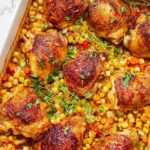 Baked Tomato Chicken Thighs with Couscous is a flavorful and comforting one-dish meal that combines tender, spiced chicken thighs roasted with a vibrant mix of vegetables and pearl couscous. Infused with Middle Eastern and Mediterranean spices like baharat and turmeric, this hearty dinner is enhanced by fresh lemon and tarragon for a bright, aromatic finish. Perfect for an easy yet impressive family dinner or entertaining guests.