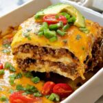 This Beef Enchilada Casserole features layers of seasoned ground beef, black beans, green chiles, and a blend of cheddar and Monterey Jack cheeses nestled between warm tortillas, all baked to melty perfection. Topped with fresh avocado, tomato, cilantro, and jalapeno, it offers a rich, comforting Mexican-inspired meal perfect for family dinners.