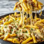This Cheesy Ground Beef Pasta Skillet is a comforting and hearty one-pan meal featuring tender ground beef simmered with aromatic garlic, onions, and herbs, combined with perfectly cooked al dente ziti pasta, and generous amounts of melted mozzarella cheese. A touch of Worcestershire sauce and tomato paste adds depth of flavor, while the crushed red chili flakes bring a mild kick. Ready in just 25 minutes, it's an easy, delicious dinner for four.