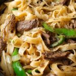 Philly Cheesesteak Pasta combines tender strips of steak, sautéed onions, and green bell peppers with pappardelle pasta in a rich, creamy, and cheesy sauce. This comforting dish offers the flavors of the classic Philly cheesesteak sandwich in a hearty pasta form, perfect for a satisfying dinner.