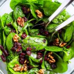 - Add Toppings: Sprinkle the roughly chopped pecans and dried cranberries over the dressed spinach. Toss gently if desired or leave on top as garnish.