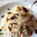 A flavorful and festive rice pilaf featuring toasted slivered almonds, dried cranberries, and aromatic green onions, cooked in a savory blend of chicken stock and butter. This easy-to-make side dish is perfect for holidays or weeknight dinners.