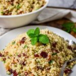 A fruity and nutty Cranberry Couscous Salad featuring toasted pecans, fresh mint, and a honey apple cider vinegar dressing. This refreshing side dish is easy to prepare and pairs perfectly with pork, chicken, or turkey.