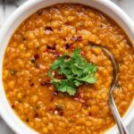 This Lentil Curry is a comforting, protein-packed dish featuring tender lentils simmered in a rich and flavorful blend of spices, crushed tomatoes, and creamy coconut milk. Perfectly paired with basmati rice and vegan naan, it offers a hearty and satisfying meal that's both wholesome and delicious.