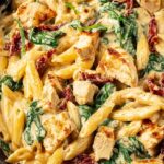 Creamy Tuscan Chicken Pasta is a comforting one-pot dish featuring tender chicken breasts, sun-dried tomatoes, spinach, and a rich creamy sauce infused with garlic and Italian seasoning. This hearty pasta combines Italian flavors with ease, making it perfect for a quick and satisfying weeknight dinner.
