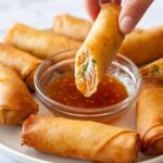 These Crispy Spring Rolls feature a flavorful filling of ground chicken, shiitake mushrooms, and fresh vegetables wrapped in thin, crispy flour-based wrappers. They are perfectly golden and crunchy when fried but can also be air-fried for a lighter option. Served with a sweet, tangy, and spicy dipping sauce, they are a delicious appetizer or snack that’s hard to eat just one of.