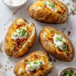 - Add toppings and serve: Top each potato with grated cheddar cheese, chopped turkey bacon, and sliced green onions. Serve each fully loaded potato with a dollop of sour cream on the side for dipping or spreading, and enjoy immediately.