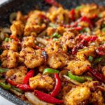 - Stir-Fry Vegetables and Chillies: Heat 2 tablespoons of the leftover frying oil in a wok or deep pan over high heat. Once hot, add the sliced onion, red and green peppers, diced garlic, and sliced red chillies. Stir-fry for 2-3 minutes until the vegetables start to soften slightly.