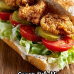 This Shrimp Po' Boy Recipe features crispy fried medium-sized shrimp seasoned with a blend of spices, served on a French baguette with shredded iceberg lettuce, sliced tomatoes, dill pickles, and a creamy Creole-inspired remoulade sauce made from mayonnaise, dill pickle relish, lemon juice, hot sauce, and capers. Perfect for a flavorful and satisfying sandwich meal.