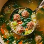 This classic Italian Wedding Soup features tender homemade mini meatballs made from lean ground beef and pork, fresh vegetables, and delicate acini di pepe pasta, all simmered in a savory low-sodium chicken broth. Finished with fresh spinach and shredded parmesan, this soup delivers a cozy, authentic flavor perfect for a comforting meal.