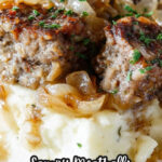 French Onion Meatballs combines savory ground beef meatballs with sweet caramelized onions, gooey Swiss cheese, and rich beef broth for a hearty, comforting meal perfect for serving over garlic toast or mashed potatoes.