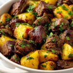 This Garlic Butter Steak Bites recipe is a delicious and easy-to-make dish featuring tender sirloin steak cubes seared in a flavorful garlic herb butter sauce, paired with perfectly seasoned and sautéed baby red and yellow potatoes. It's a savory, hearty meal perfect for dinner or a special occasion.