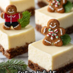 - Chill and Serve: Remove the cheesecake from the oven and water bath, then refrigerate for 2 hours to overnight. Once chilled, lift the cheesecake out using the parchment paper overhang, cut into 12 bars, and garnish with mini gingerbread cookies or sprinkles if desired.