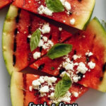 - Assemble and Serve: Arrange the grilled watermelon on a serving platter. Sprinkle evenly with crumbled feta and garnish with torn basil leaves before serving.