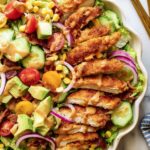 - Assemble the salad: On a large platter, spread chopped romaine lettuce. Evenly distribute cucumber slices, cherry tomatoes, crumbled bacon, diced avocado, corn, and thinly sliced red onion over the lettuce. Slice the cooked chicken cutlets and arrange them on top, retaining their shape for presentation.