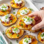 Loaded Baked Potato Rounds are crispy, buttery potato slices topped with melted cheddar cheese, crispy bacon, sour cream, and green onions. Perfect as a delicious appetizer or snack for game day or any gathering.