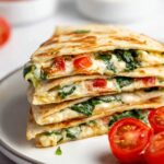 Mediterranean Quesadillas feature flour tortillas filled with a delicious blend of feta and mozzarella cheeses, fresh spinach, diced tomato, and red onion. This quick and wholesome recipe is perfect for a nutritious weekend lunch or a busy weeknight dinner, ready in just 15 minutes.