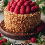 Finally, using your hands, gently press the reserved ground pistachio powder onto the frosted exterior of the cake until it’s fully coated. This step adds texture, color, and a nutty finish. Top the cake with fresh raspberries for a gorgeous and inviting touch.