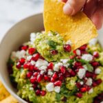 - Garnish and serve: Transfer the guacamole to a serving bowl. Sprinkle the remaining pomegranate arils on top along with additional chopped cilantro. Add crumbled feta if desired. Serve immediately with tortilla chips or fresh vegetables.