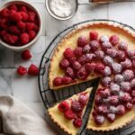 This Raspberry Almond Frangipane Tart features a rich almond filling known as frangipane, layered over a raspberry preserves base and topped with fresh raspberries and sliced almonds. This classic French pastry showcases a buttery almond custard baked in a crisp almond sablé tart shell, resulting in a deliciously nutty and fruity dessert perfect for any occasion.