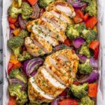 This Sheet Pan Chicken and Roasted Vegetables recipe offers a simple and delicious one-pan meal featuring succulent chicken paired with a mix of roasted sweet potatoes, Yukon or red potatoes, bell pepper, onion, and Brussels sprouts. The chicken is seasoned with a flavorful blend of paprika, thyme, salt, and pepper, and roasted alongside the vegetables for an easy, comforting dinner.