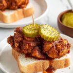 - Serve: To serve, layer the hot chicken on slices of white bread and top with sliced pickles on toothpicks for the classic Nashville presentation.
