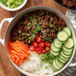 A flavorful and easy-to-make Spicy Sesame Ground Beef Bowl featuring a savory sesame sauce with coconut sugar and aminos, cooked ground beef, and fresh aromatics. Perfect served over rice, pasta, potatoes, or lettuce for a satisfying meal.
