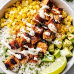 This Street Corn Chicken Rice Bowl features juicy, seasoned chicken thighs paired with grilled sweet corn, tangy lime-infused crema, and crumbly Cotija cheese served over fluffy cooked rice. A perfect blend of smoky, creamy, and zesty flavors for a fresh and satisfying meal easily customizable with your favorite toppings.