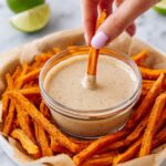 Crispy oven-baked sweet potato fries served with a zesty chipotle lime dipping sauce, perfect as a flavorful side or snack.