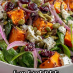 - Assemble Salad: In a large bowl, combine the roasted sweet potatoes, baby arugula, sliced shallots, dried cranberries or cherries, pepitas, and feta or goat cheese crumbles if using. Add the 6 tablespoons of dressing and gently toss to combine.