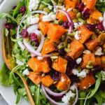 This easy sweet potato salad combines tender roasted sweet potatoes with crisp baby arugula, sweet cranberries, crunchy pepitas, and creamy feta cheese, all tossed in a flavorful honey mustard dressing. Perfect as a satisfying fall side dish or light main course, this salad offers a delightful balance of sweet and savory flavors with a variety of textures.