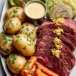 A traditional Corned Beef and Cabbage recipe featuring tender corned beef simmered with aromatic spices and stout beer, served with perfectly cooked potatoes, carrots, and cabbage. This hearty dish is perfect for a comforting main meal.